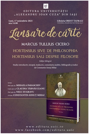 Luni, 17 noiembrie 2025, ora 14.00, la Librăria OREST TAFRALI (Universitatea „Alexandru Ioan Cuza” din Iași, corp A, parter), va avea loc lansarea ediției bilingve Hortensius sive De philosophia / Hortensius sau Despre filosofie , de Marcus Tullius Cicero.
